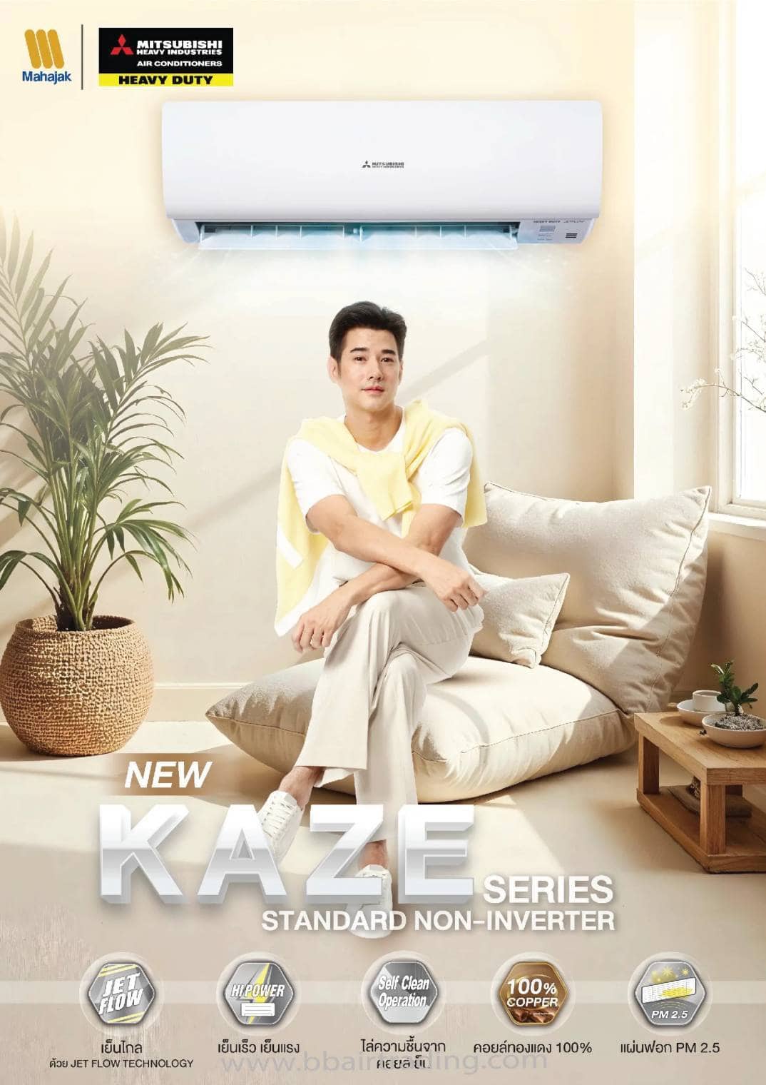 มิตซูบิชิ เฮฟวี่ ดิวตี้ เย็นเร็ว ทนทาน ประหยัดไฟ รับประกันเปิดต่อเนื่อง 24 ชั่วโมง นาน 5 ปี มาพร้อมกับระบบ JET FLOW (เทคโนโลยีไอพ่นเจ็ท) การออกแบบระบบจ่ายลมด้วยเทคโนโลยีเดียวกับใบพัดในเครื่องยนต์เจ็ท ทำให้สามารถส่งไปได้ในระยะไกล ผลิตภัณฑ์มาตรฐานญี่ปุ่น ต้อง มิตซูบิชิ เฮฟวี่ ดิวตี้ (มหาจักร) เท่านั้น